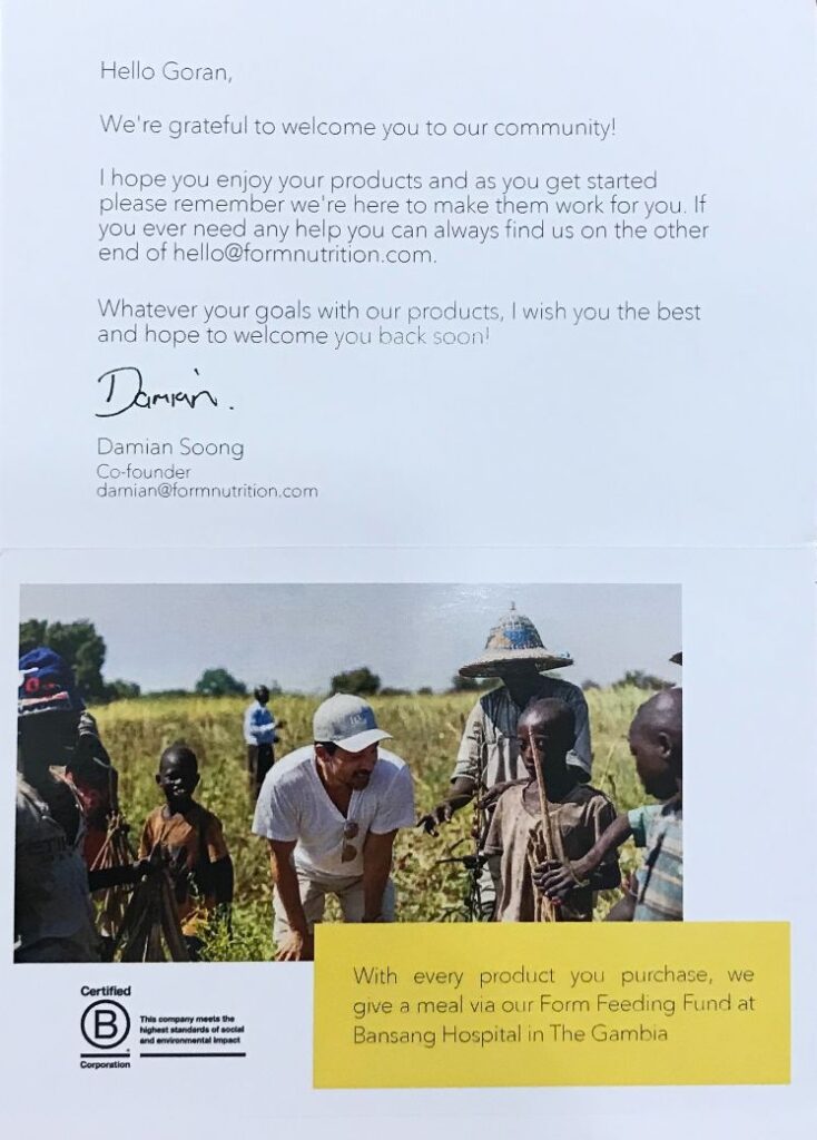 First of all- besides their great products they also make their customers feel appreciated by sending them a personalized message in the package that they ordered. If you are vegan, you definitely worry about the environment and the Form Nutrition has come up with a solution to wrap their products in 100% plastic-free, compostable packaging-that way by using their products you won’t only be friendly to your own organism, but also ecologically aware.